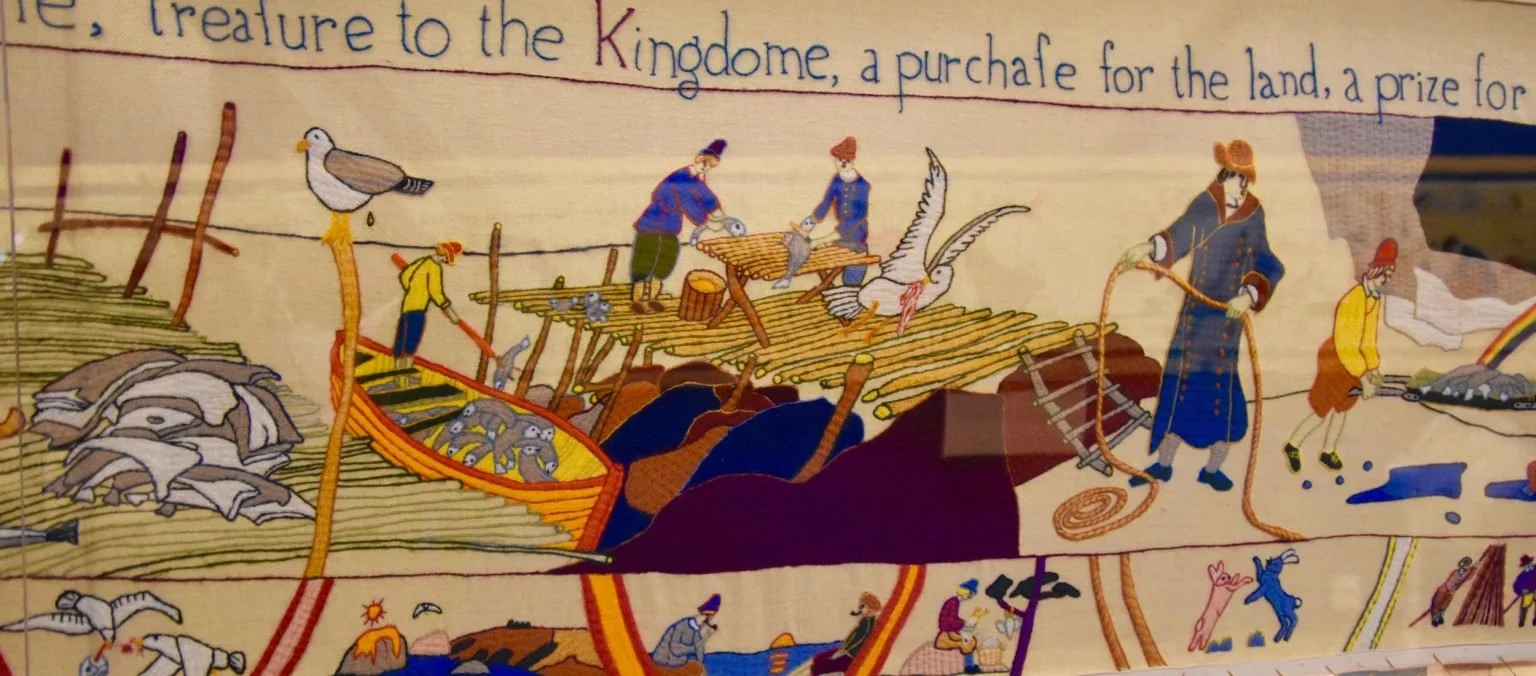 The French Shore Tapestry is a 227-foot hand-embroidered artwork that illustrates centuries of Newfoundland’s French fishing heritage in detail - crafted by hand by the women of Conche.
